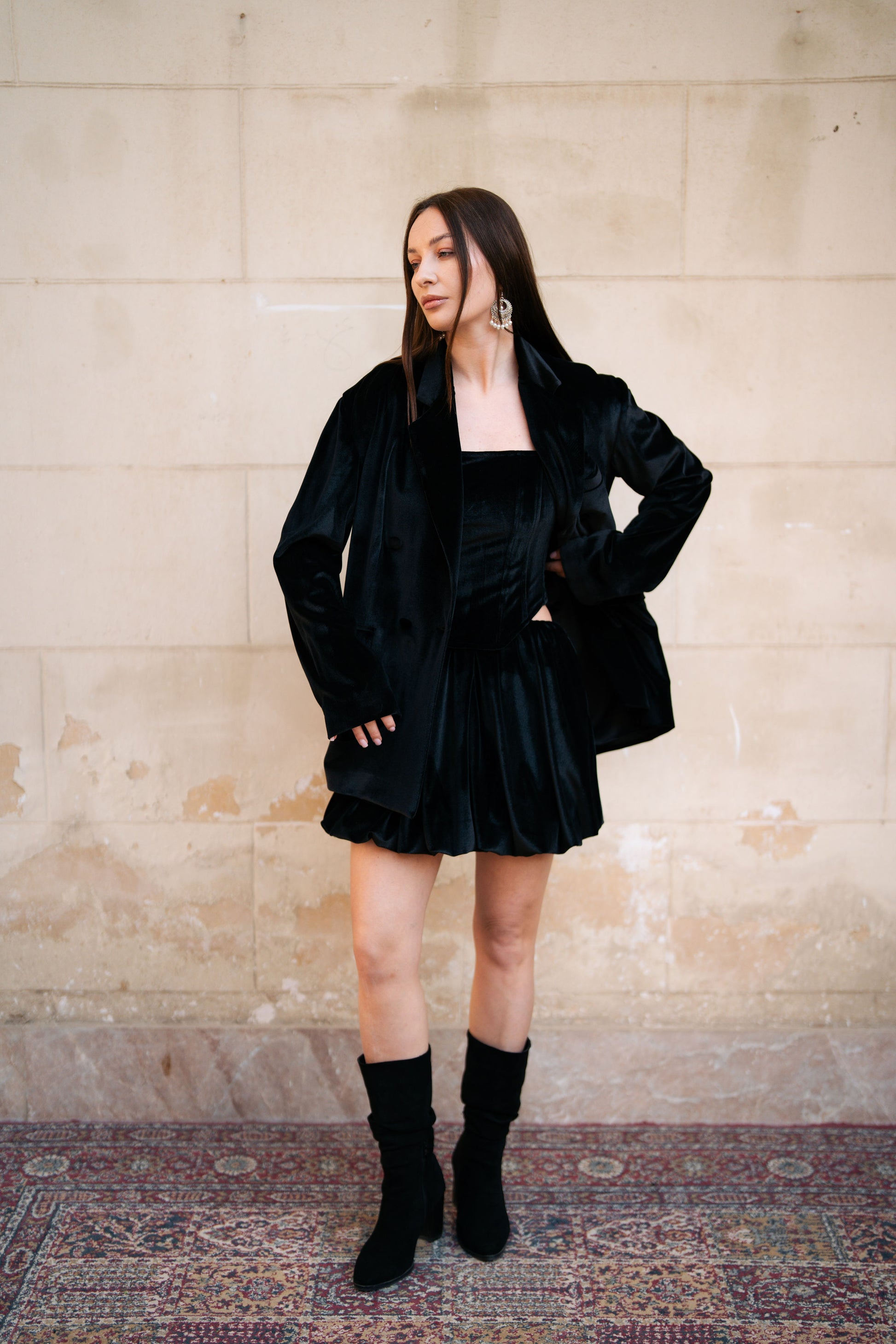 The set consists of 3 pieces: Corset, blazer & a balloon skirt